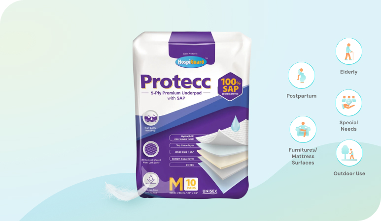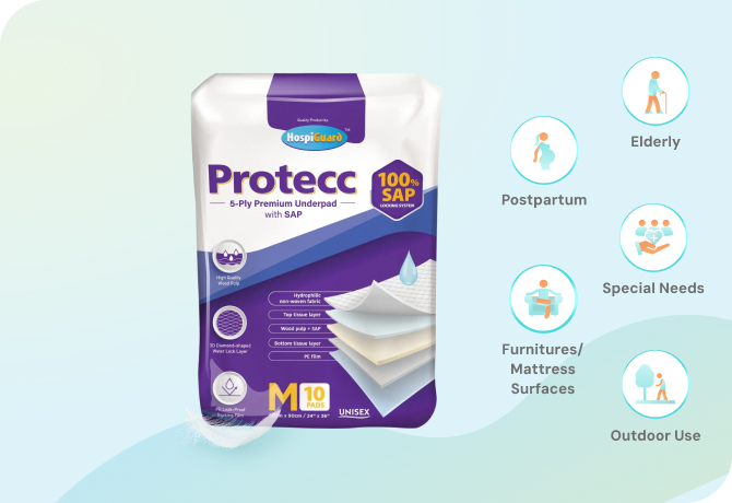 5 layers of defence protects mattresses and furnitures. Highly absorbent and easy-to-use surface pads for multi-purpose use.